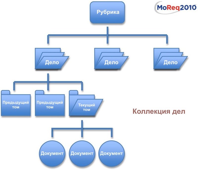 Концепция дела в MoReq2010 совпадает с делами MoReq2, не имеющими суб-дел (см. рис.). В отличие от папок, дела могут подразделяться на тома.